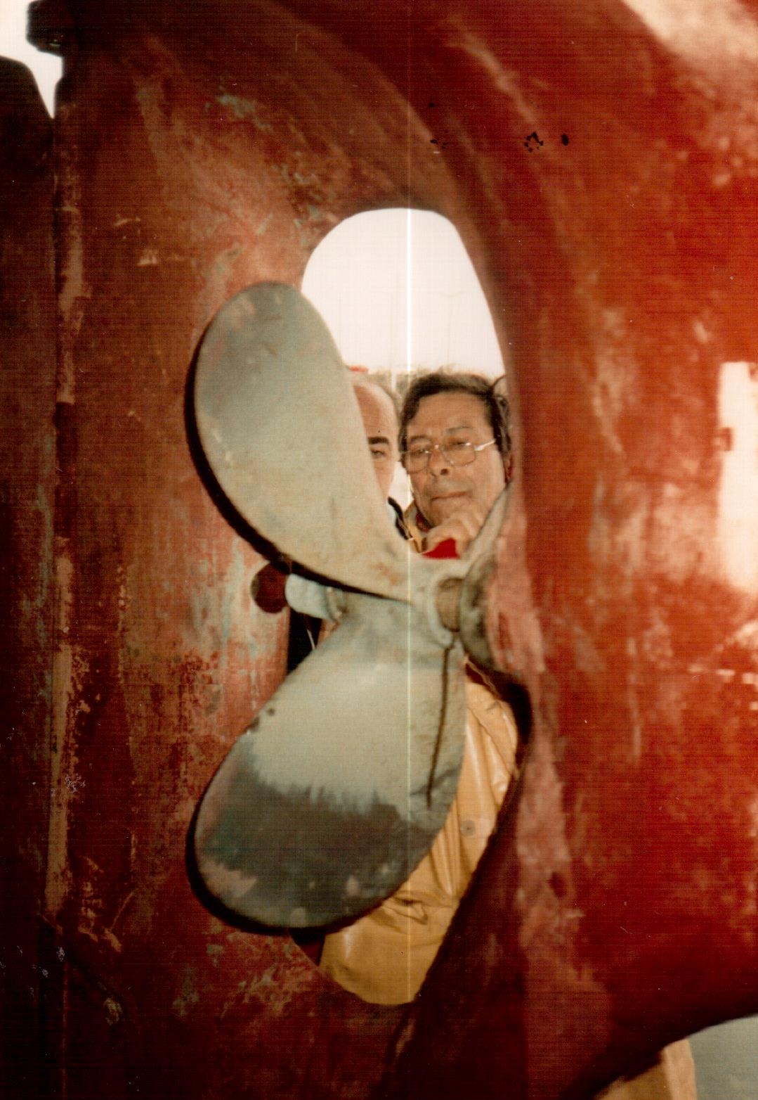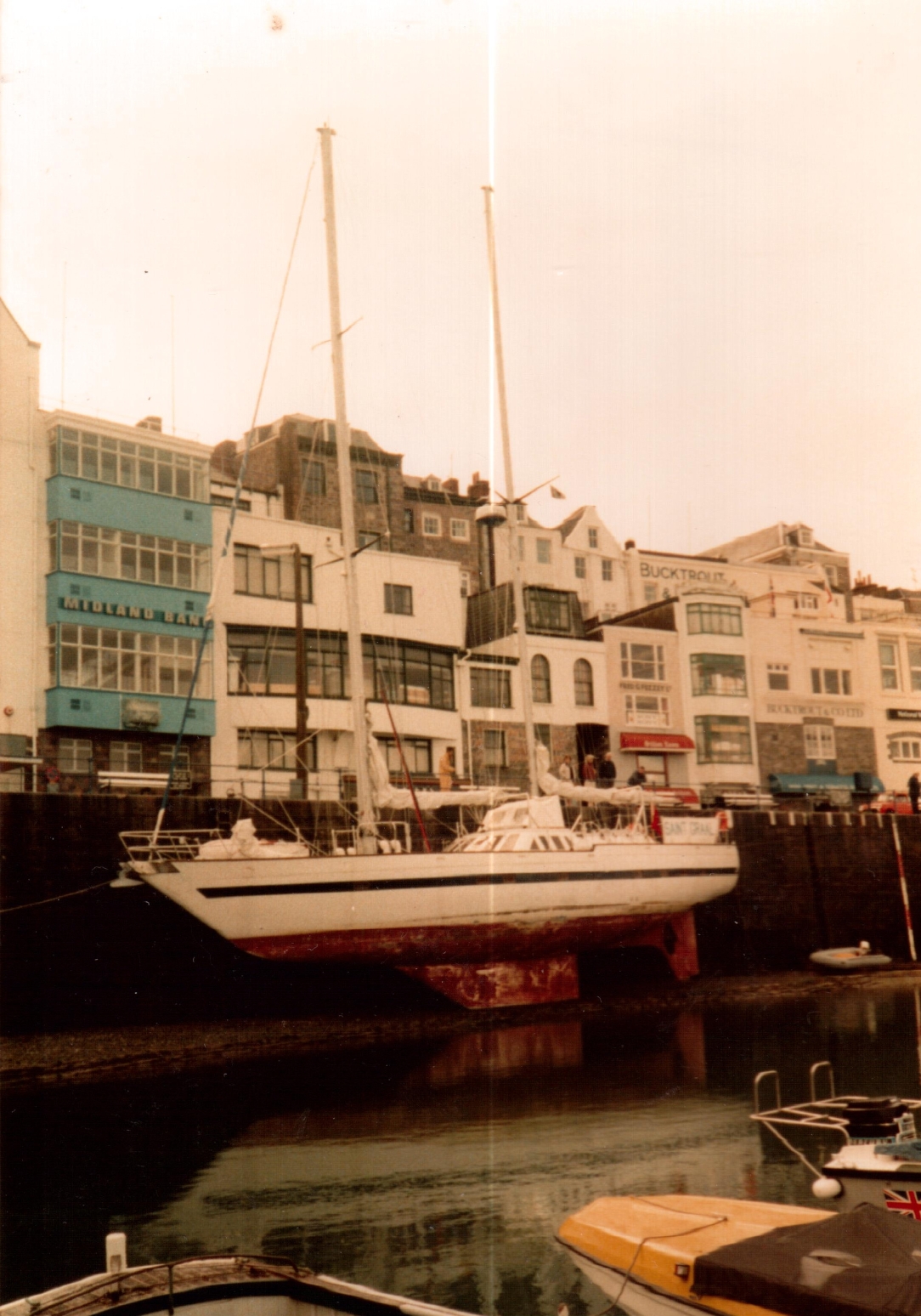 Ils font escale à Saint-Peter-Port. Yves décide d’examiner l’hélice. Le bateau est placé contre un quai et la marée descendante va le mettre au sec. On imagine les problèmes pour poser un bateau de 35 tonnes, à quille étroite et sans béquilles, sur un fond mal connu et pour la première fois ! Yves a une grande expérience de ce genre de manœuvres avec Kernevel, cependant ici, la surface portante de la quille du Saint-Graal est bien plus petite et le bateau 4 fois plus gros ! Il y a un équilibre avant/ arrière risqué et il faut bien saisir le bateau à quai avec tout un réseau d’amarres (y compris sur les mâts) pour éviter une bascule avant arrière ou latérale. Yves ne dit pas un mot des angoisses qu’il a du vivre au fur et à mesure que la marée descendait. Mais tout se passa bien.
