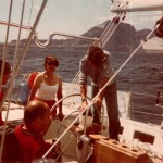 Dans ces premières pages du livre de bord, je ne trouve nulle exultation d’Yves pour ce grand départ, aboutissement de cinq ans d’acharnement. Mais il est vrai qu’Yves n’était pas démonstratif. Mais quelles contraintes pour lui lorsqu’on lit la litanie de ses travaux forcés ; il ne se passait pas un jour sans qu’il ne soit obligé de finir, de fignoler ou réparer quelque chose à bord. Après le pot d’échappement qui avait lâché et failli nous asphyxier dans le trajet Saint–Valery/Cowes, c’est l’hélice qui alerte Yves : elle fait un bruit anormal, le moteur étant arrêté, elle semble desserrée : l’hélice entraine l’arbre, mais poussé en arrière. Yves fait essais de mise en marche du moteur pour tenter de bloquer l’hélice, sans succès. Heureusement le vent leur permet de marcher à la voile à 8/9 nœuds et d’arriver à Guernesey le lendemain avec des creux de 4/5 m et des déferlantes. (Pauvre Eliane !)