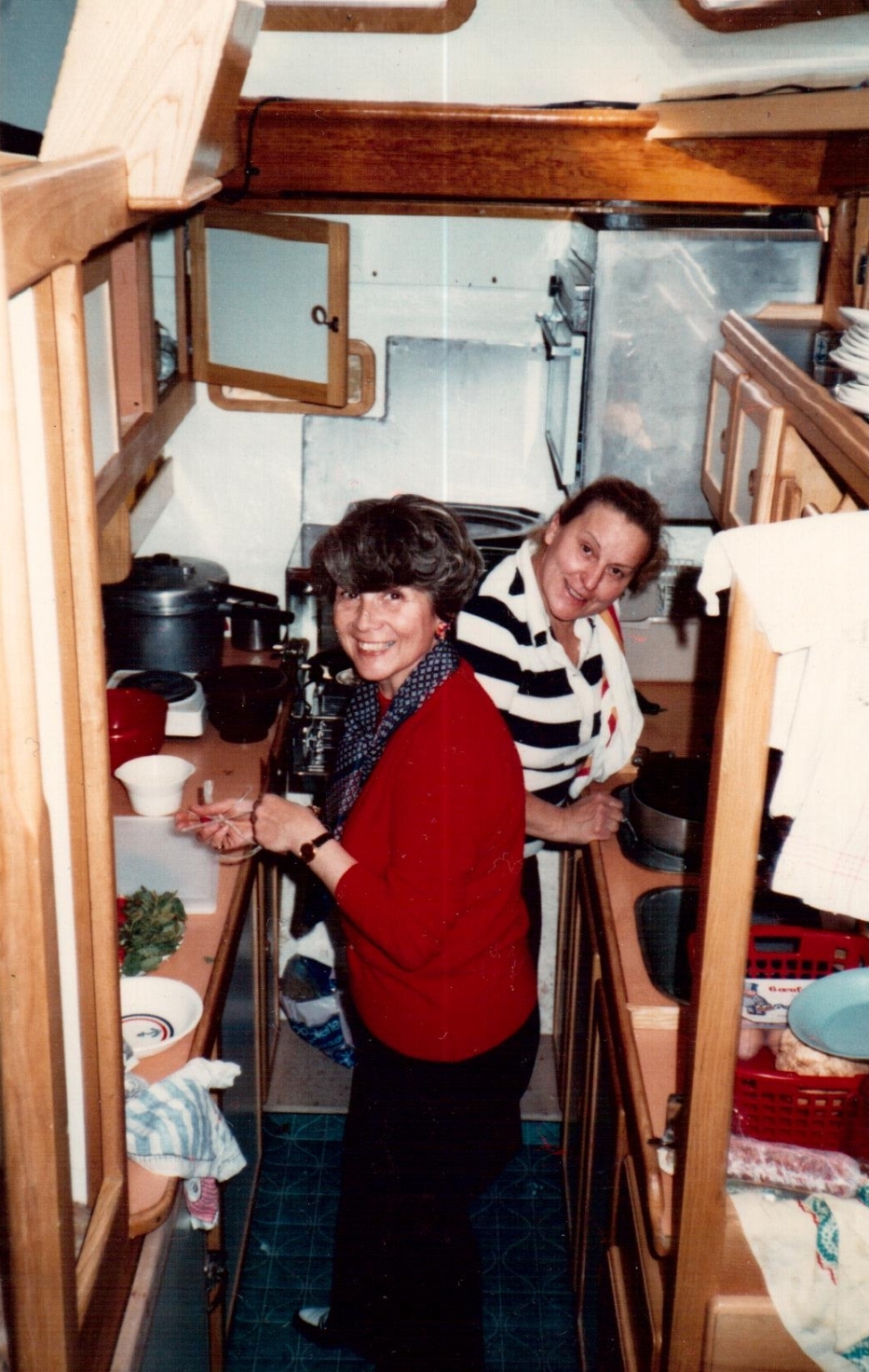 Les derniers mois, durant toute la semaine je m’activais à réaliser tous les rideaux pour les capots ou hublots, les draps de forme spéciales pour couchettes. Je constituais aussi l’équipement hôtelier complet : vaisselle, batteries de cuisine matériel et linge, couvertures. Enfin, avant de prendre la mer je réalisais tout l’avitaillement du bateau (ex-économe de clinique) et la congélation des victuailles fraîches prévues pour les 4 mois à venir. J’ai aussi enregistré une centaine de cassettes avec des musiques de toutes sortes et constitué une bibliothèque de lecture, mais aussi de documents touristiques ou archéologiques sur les pays où nous devions naviguer, constitué une large pharmacie de base et d’urgence (ex-infirmière-anesthésiste), Parallèlement je me tenais en contact avec les agences de charter, j’établissais un agenda des locations prévues et le planning des navigations pour que nos amis ou équipiers puissent s’inscrire et préciser leurs arrivées aux escales. J’inventais des dépliants publicitaires à diffuser, je vendais tout ce qui pouvait nous rester qui désormais nous serait inutile…